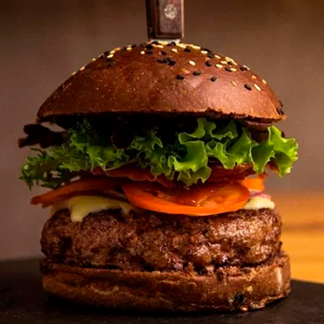 Ingredientes: Pão brioche, 1 hamburguer angus de 180g, bacon, milho, alface, tomate, mussarela, molho da casa
