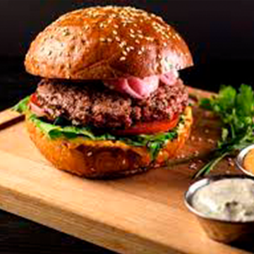 Ingredientes: Pão brioche, 1 hamburguer de costela de 180g, bacon, milho, alface, tomate, mussarela, molho da casa